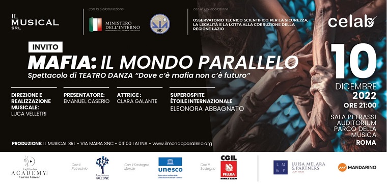 Il giorno 10 dicembre 2022 con inizio alle ore 21:00, presso la Sala Petrassi dell’Auditorium Parco della Musica di Roma, nell’ambito delle celebrazioni per il trentennale delle stragi di mafia del 1992/1993, si svolgerà uno spettacolo di Teatro - Danza dal titolo “mafia: il mondo parallelo”. All’evento, realizzato in collaborazione con la Direzione Investigativa Antimafia,