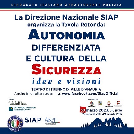 Nei giorni 29, 30 e 31 marzo p.v. a Tuenno di Ville d’Anaunia (Tn) il SIAP Sindacato Italiano Appartenenti Polizia ha programmato i lavori della propria Direzione Nazionale dedicata ai delicati temi del lavoro dei Poliziotti e delle Poliziotte e le ricadute sui livelli di Sicurezza dei cittadini, alle funzioni svolte dalle Forze di Polizia e al ruolo delle stesse nel Paese; in tale occasione si terrà, il giorno 30 marzo dalle ore 15,30 presso il Teatro del borgo, la Tavola Rotonda dal titolo Autonomia differenziata e cultura della Sicurezza, idee e visioni. (...)