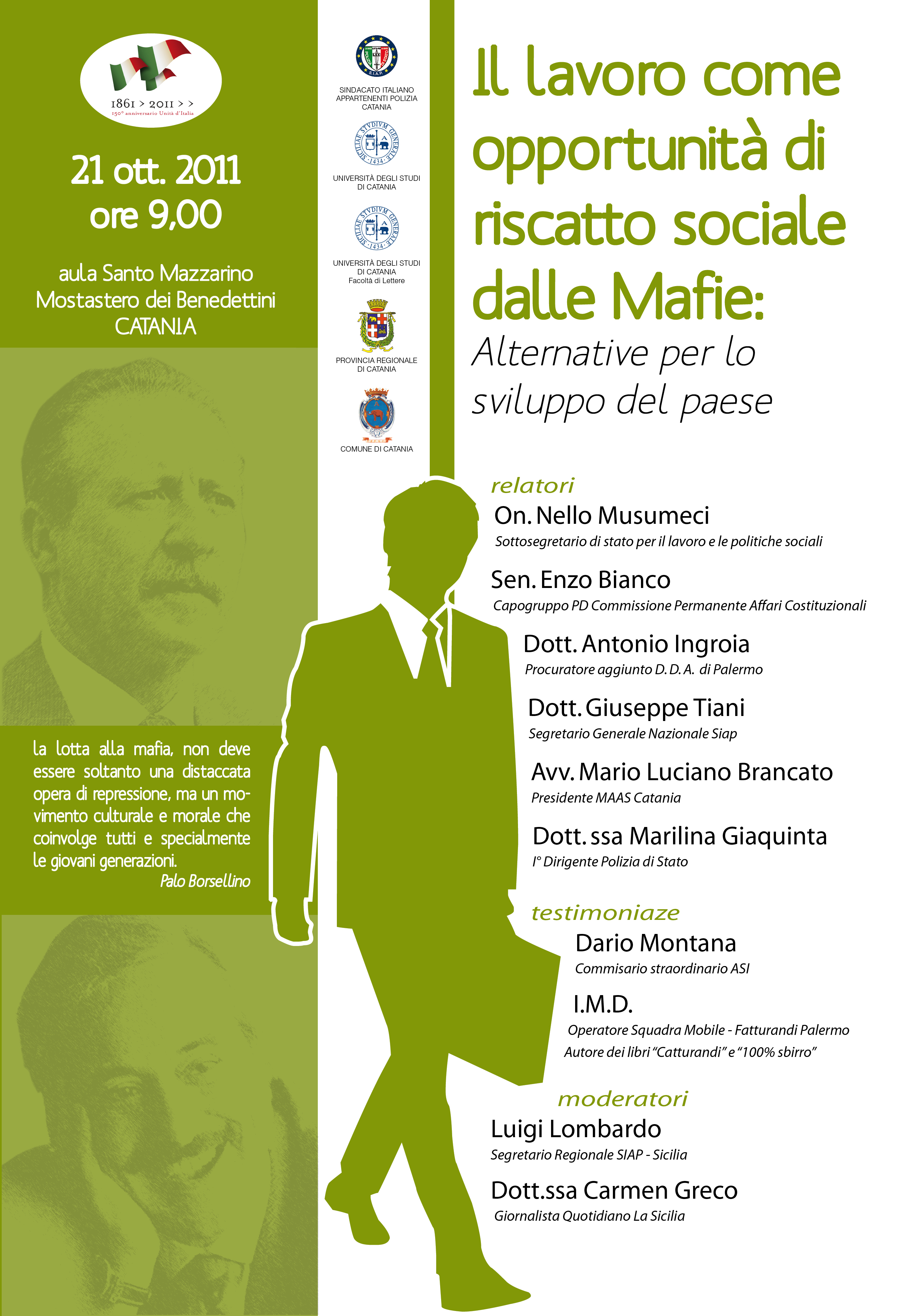 Nella prestigiosa cornice del Museo dei Benedettini di Catania presso la facoltà di lettere si è svolto il Convegno Sul lavoro a Cui hanno partecipato quali relatori On Musumeci e On Bianco, oltre al collegamento telefonico con il dott Ingroia Magistrato. Molti giovani partecipanti e il nostro segretario nazionale Tiani.
