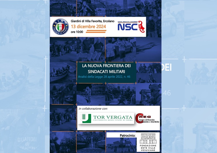 Organizzato dal SIAP e da NSC, in collaborazione con l'Università Tor Vergata di Roma e il Centro di Ricerche Economiche e Giuridiche, si terrà il giorno 13 dicembre 2024 il convegno dal titolo "La Nuova Frontiera dei Sindacati Militari. Analisi della Legge 28 aprile 2022, n. 46" (...)