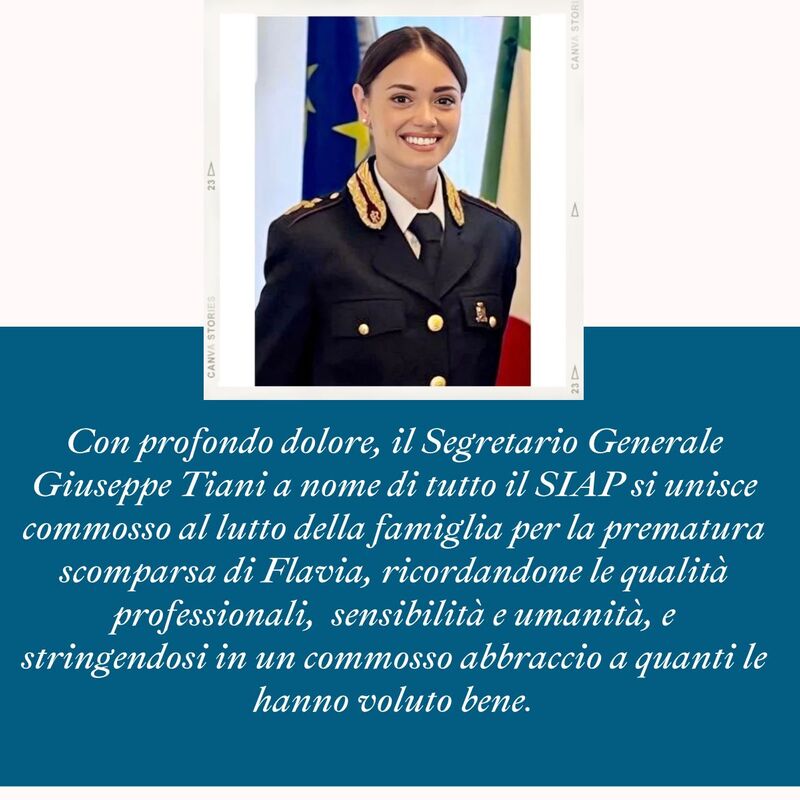 Con profondo dolore, il Segretario Generale Giuseppe Tiani a nome di tutto il SIAP , si unisce commosso al lutto della famiglia per la prematura scomparsa di Flavia, ricordandone le qualità professionali, sensibilità e umanità, stringendosi in un commosso abbraccio a quanti le hanno voluto bene.