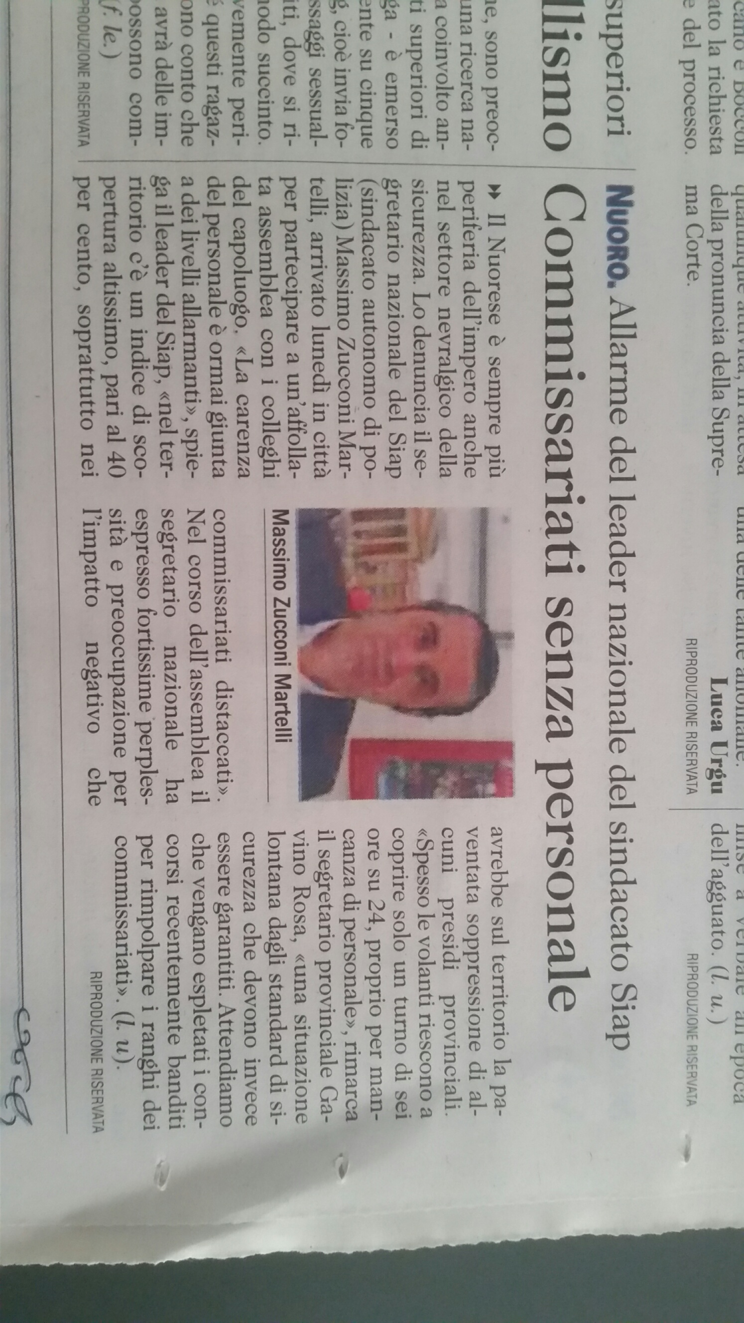 4. Nuoro:Polizia, il Siap denuncia carenze d'organico nel nuorese