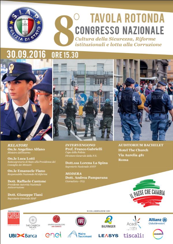 In occasione dell'8° congresso nazionale che si svolgerà a Roma dal 29 settembre al 1 ottobre p.v., il giorno 30 settembre, alle ore 15.30, è previsto il convegno avente per tema " Cultura della sicurezza, Riforme Istituzionali e lotta alla Corruzione".