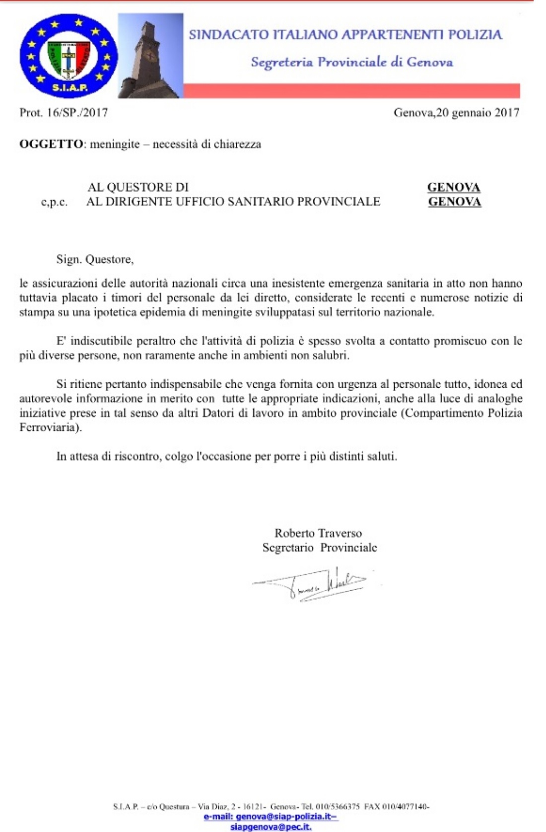 Le autorità sanitarie nazionali, come noto, hanno ufficialmente escluso epidemie o emergenza sanitaria ma i poliziotti genovesi, non adeguatamente informati dall'Amministrazione,non si sentono tranquilli.