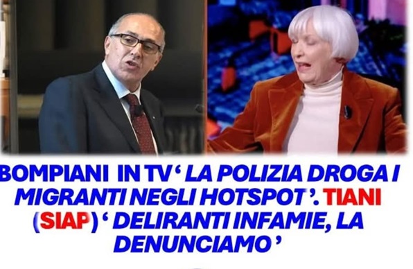 Così Giuseppe Tiani segretario generale SIAP entra nelle polemiche generate dalle dichiarazioni della scrittrice secondo cui i migranti negli hotspot vengono drogati dalla polizia . Accuse e parole gravissime per le quali abbiamo dato mandato ai nostri legali per procedere nei suoi confronti non è possibile tollerare in silenzio un tale delirio che inocula nella popolazione un'idea fuorviante delle funzioni di polizia - prosegue Tiani -. Approfittando come al solito dell'assenza di un contraddittorio adeguato alle problematiche trattate come avviene normalmente in tutte le trasmissioni la signora Ginevra Bompiani ha pronunciato parole e accuse gravissime sul ruolo dei poliziotti e sul loro operato professionale giungendo ad affermare che la Polizia droga i migranti negli hotspot. Parole che esprimono un furore ideologico da salotto sconnesso dalla realta' e fuori dal tempo e dalla storia che i poliziotti e le poliziotte del Siap non possono accettare ne' ignorare. Ragione per cui abbiamo dato mandato al nostro studio legale per procedere nei confronti della signora Bompiani . 9Colonne